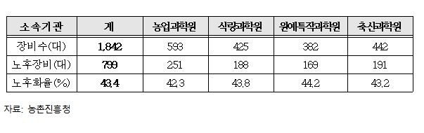 국회 농림축산식품해양수산위원회 소속 정희용 국민의힘 의원이 11일 농촌진흥청으로부터 제출받은 국정감사 자료에 따르면, 농촌진흥청 소속 연구기관 보유 연구장비의 노후화율이 매년 증가하며 43.8%에 육박하는 것으로 드러났다. 농진청이 수행하는 연구의 신뢰도 제고를 위해서는 노후장비 교체가 시급하다는 지적이다.