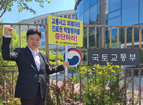 대한한의사협회 윤성찬 회장이 23일 세종특별자치시 국토교통부 청사 앞에서 '자동차손해배상 보장법 시행령 및 시행규칙' 개정안의 즉각적인 철회를 촉구하는 1인 시위를 펼쳤다.