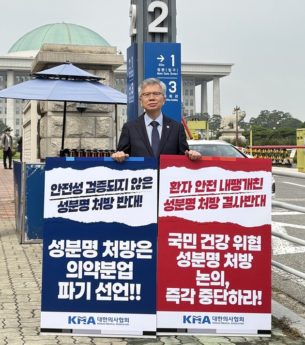 국회가 '성분명 처방' 법제화를 논의하는 가운데 의료계가 이를 두고 "의약분업 파기"라고 비판하며 즉각 중단을 촉구하고 나섰다. 특히 김택우 대한의사협회장은 30일 성분명 처방 토론회가 예정된 국회 앞에서 1인시위에 돌입하며 법안 반대 입장을 표명했다.