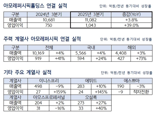 회사 측은 라네즈, 에스트라, 설화수, 려 등 주요 브랜드의 글로벌 확산과 운영 효율화를 기반으로 주력 계열사인 아모레퍼시픽이 그룹 전체 매출 성장과 수익성 개선을 이끌었다고 분석했다.