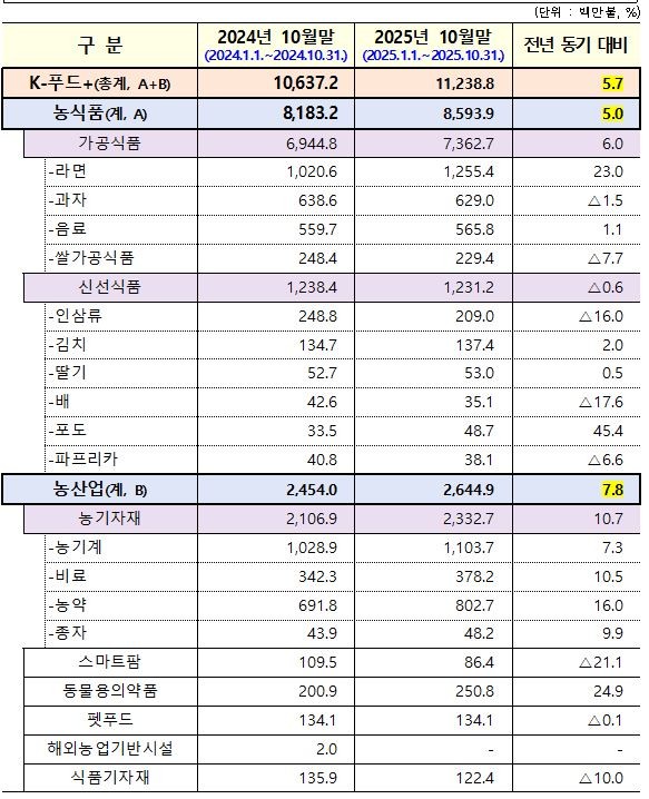 농림축산식품부(장관 송미령, 이하 농식품부)는 2025년 10월 케이-푸드 플러스(K-푸드+) 수출액(누적, 잠정)이 지난해보다 5.7% 증가한 112억4천만달러를 기록했다고 밝혔다.