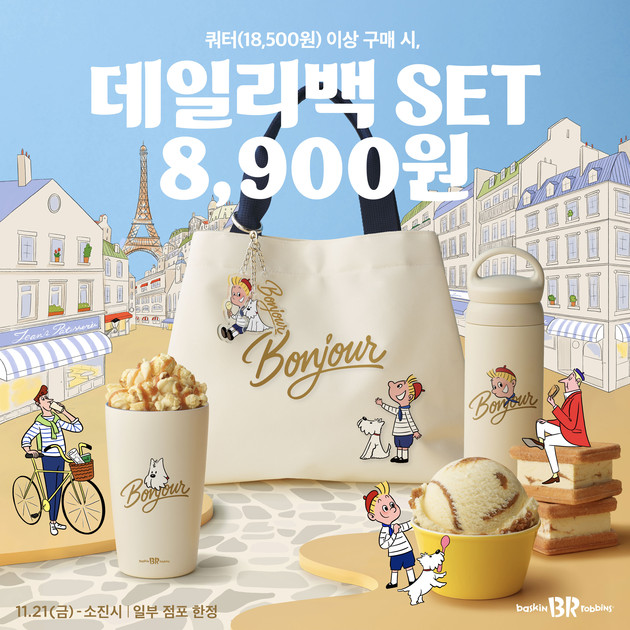 연노랑색의 데일리백은 엔리케의 일러스트 캐릭터와 '봉주르(Bonjour)' 문구가 새겨진 디자인으로, 텀블러 등 소지품을 담을 수 있는 다용도 가방이다. 귀여운 일러스트로 구성된 스티커팩과 아크릴 키링은 다이어리 꾸미기나 가방 장식 등으로 활용할 수 있다. 일부 매장에서는 엔리케 작가 일러스트 디자인의 텀블러 2종도 만나볼 수 있다. 자세한 내용은 배스킨라빈스 홈페이지에서 확인 가능하다.