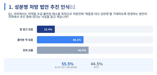 설문조사 결과, 국민 절반에 가까운 44.5%는 현재 국회에 계류 중인 성분명 처방 법안에 대해 전혀 모른다고 답했다. 잘 알고 있다는 응답은 15.4%에 불과했다.