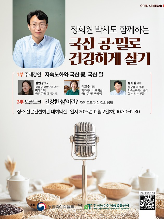 농림축산식품부(장관 송미령)와 한국농수산식품유통공사(aT, 사장 홍문표)는 내달 2일 '국산 콩·밀로 건강하게 살기' 오픈세미나를 개최한다고 밝혔다.