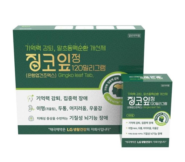 징코잎정120mg은 은행엽건조엑스 120mg을 함유한 제품으로 은행나무잎에서 유효성분을 추출했다. 주요 약리작용으로는 혈소판 응집을 억제하고 혈관을 확장시켜 혈액 순환을 개선하고 항산화작용을 한다.