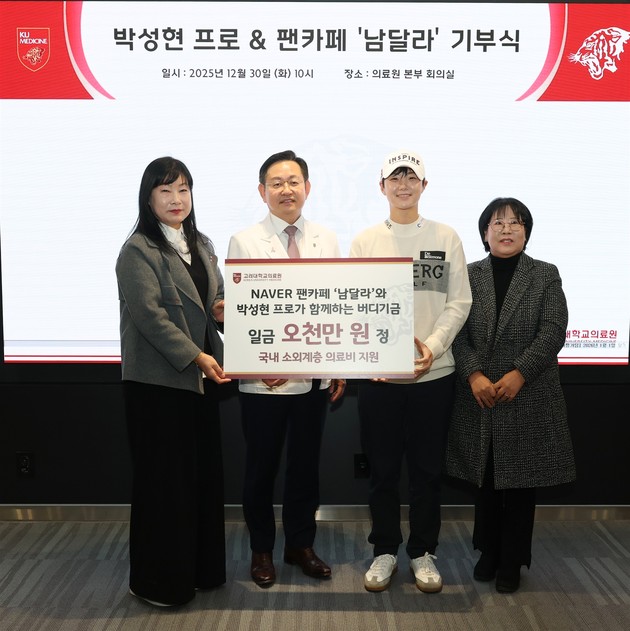 고려대학교의료원(의무부총장 겸 의료원장 윤을식)이 프로골퍼 박성현 선수와 팬카페 '남달라'로부터 국내 소외계층 지원을 위한 자선기금 5천만원을 전달받으며 연말 따뜻한 온기를 나누었다.