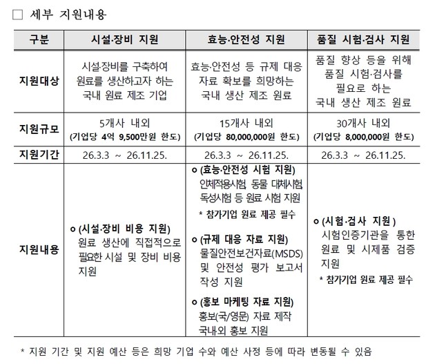 시설·장비 지원 사업은 개발이 완료된 국내 제조 원료의 생산 기반 마련을 목표로, 원료 생산에 직접 필요한 설비와 장비 구축 비용을 총 5개사 내외 선정해 기업당 최대 4억9500만원까지 지원한다<표 참조>.