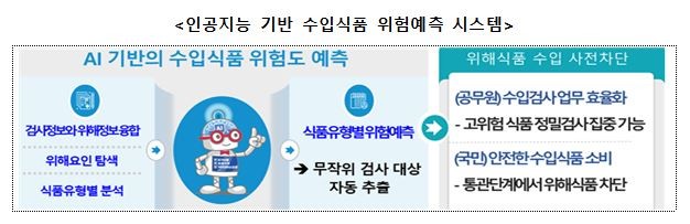'AI 수입식품 검사관(AI 위험예측 시스템)'으로 위해 우려가 큰 수입식품을 핀셋 검사한다. AI 위험예측 시스템은 '수입식품 검사 정보', '해외 위해정보' 등을 융합한 빅데이터를 인공지능(AI)이 학습해 부적합 가능성(위험도)이 높은 식품을 통관 과정에서 자동으로 선별한다.