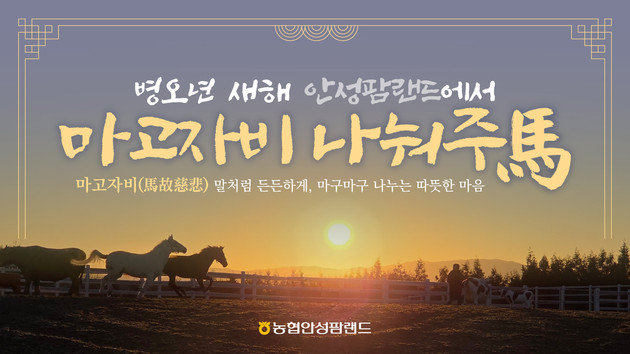 농협경제지주 안성팜랜드(분사장 강민경)는 병오(丙午)년, 말(馬)의 해를 맞아 1월 1일부터 안성팜랜드에서 말 체험을 중심으로 다양한 참여형 프로그램을 운영하는 '마고자비 나눠주마(馬)' 테마 이벤트를 진행한다고 밝혔다.