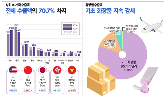 미국으로의 수출은 거의 모든 유형별로 증가했으며 특히 기초화장용 제품류는 2024년 대비 1억7000만달러(14억→15.7억달러, +12.1%), 색조화장품 제품류 5000만달러(2.6억→3.1억달러, +19.2%), 인체세정용 제품류 3000만달러(0.9억→1.2억달러, +33.3%) 순으로 수출이 증가했다.