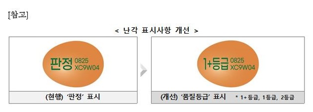 이번에 바뀐 제도에 따라 '등급판정을 받은 후 포장하는 공정'을 갖춘 업체에 한해 계란 껍데기에 품질등급(1+·1·2 등급)을 표시할 수 있도록 했으며, 이와 달리 포장 후 등급판정을 받는 업체는 기존과 같이 계란껍데기에 "판정" 표시만 할 수 있다.