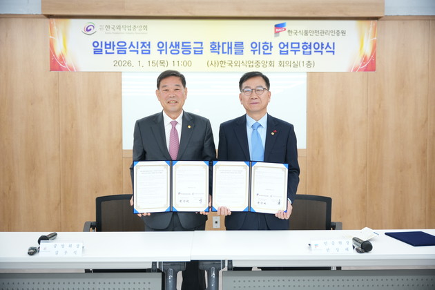 한국식품안전관리인증원(원장 한상배, 해썹인증원)과 사단법인 한국외식업중앙회(회장 김우석)는 1월 15일에 한국외식업중앙회에서 일반음식점의 식품안심업소(위생등급 지정업소) 확대를 위한 업무협약(MOU)을 체결했다.