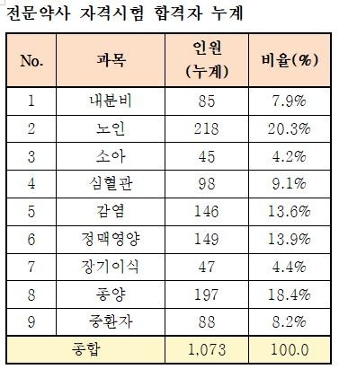 발표된 시험 결과에 따르면, 총 9개 전문과목에 응시한 441명 중 352명이 합격해 79.8%의 합격률을 기록했다. 이로써 제3회 시험까지 배출된 누적 전문약사는 총 1073명으로 집계됐다. 과목별 비중을 살펴보면 '노인' 분야가 218명(20.3%)으로 가장 많았으며, 종양(18.4%), 정맥영양(13.9%), 감염(13.6%) 순으로 나타났다.