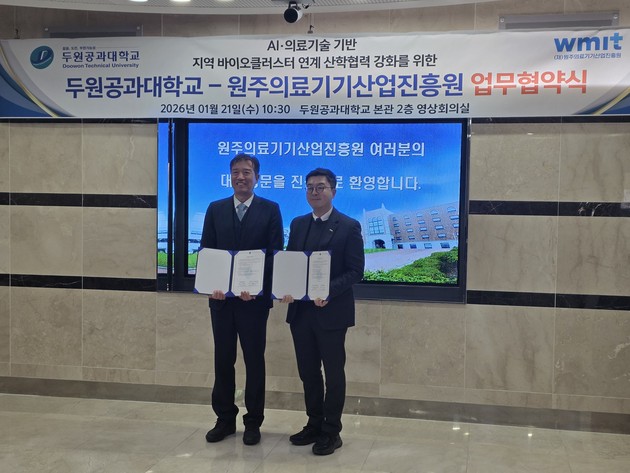 원주의료기기산업진흥원(원장직무대행 황동훈, 이하 WMIT)과 두원공과대학교는 21일 두원공과대학교 파주캠퍼스에서 인공지능(AI) 및 의료기술을 중심으로 한 바이오클러스터 연계 협력 체계 구축을 위해 업무협약(MOU)을 체결했다.