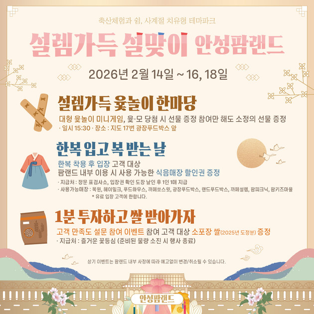 농협경제지주 안성팜랜드(분사장 강민경)는 14일부터 18일까지(17일 제외)'설렘가득 설맞이'이벤트를 진행한다고 밝혔다.