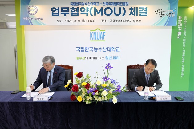 한국농수산대학교(총장 이주명, 이하 한농대)는 3월 9일 한농대 본관에서 전북국제협력진흥원(원장 김기수, 이하 진흥원)과 국제농업교육 협력 등을 위한 업무협약을 체결했다.
