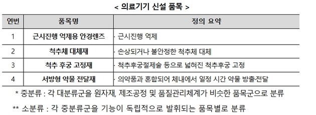 개정안에 따르면 그동안 별도의 소분류 품목이 없어 중분류 또는 한시 분류 품목으로 허가를 받아야 했던 ▲근시 진행 억제용 안경렌즈 ▲척추체 대체재 ▲척추 후궁 고정재 ▲서방형 약물 전달재 등 4개 품목이 새롭게 신설됐다.