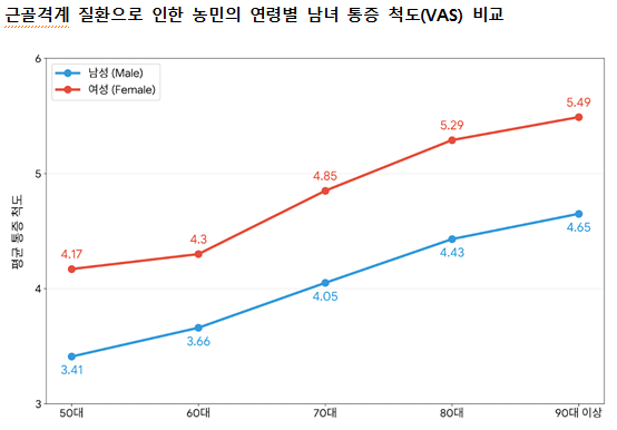 연세대학교 스포츠재활연구소(소장 이세용)가 농림축산식품부·농협중앙회와 함께 진행한 '2025년 농촌 왕진버스' 사업 조사 결과에 따르면, 전국 농민 1만656명 중 79.6%가 하나 이상의 근골격계 질환을 앓고 있었다. 성별 유병률은 여성(83.1%)이 남성(72.8%)보다 높았으며, 통증 척도(VAS) 또한 여성(4.8)이 남성(4.0)을 상회했다.