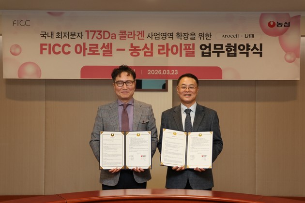 농심이 지난 23일 서울 동작구 농심 본사에서 화장품 제조 기업 '에프아이씨씨(FICC)'의 바이오 뷰티 브랜드 '아로셀'과 콜라겐 화장품 개발을 위한 업무협약(MOU)을 체결했다.