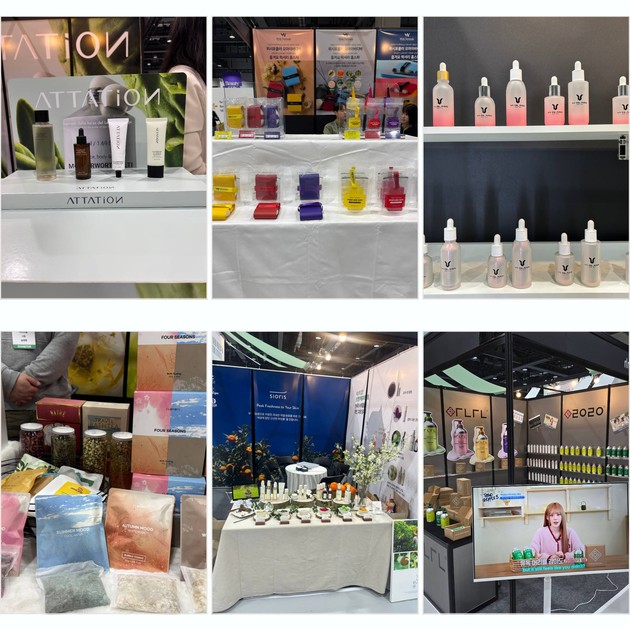소폼은 사용이 간편한 티백 타입 입욕제를, 유니자르는 국내 최초의 파우더 제형 여성청결제 등 독창적 제형 기술을 뽐냈으며, 어라운드블루는 커피박·굴껍데기 등 소재 질감을 살린 무가공 패키지로 주목받았다. LX판토스는 K-뷰티 특화 솔루션과 성장 단계별 맞춤형 물류 전략을 제안해 뷰티 기업들의 상담이 줄을 이었다.