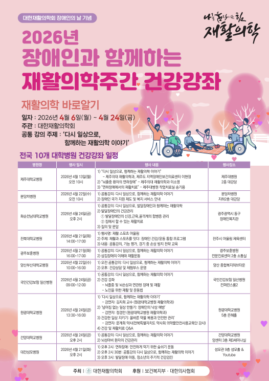 대한재활의학회(회장 신희석, 이사장 윤준식)가 오는 4월 20일 '장애인의 날'을 맞아 전국 10개 대학병원에서 '2026년 장애인과 함께하는 재활의학주간 건강강좌'를 개최한다고 밝혔다.