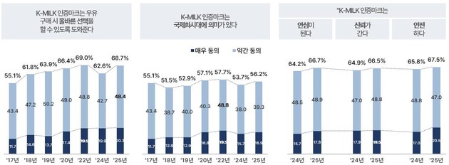 국산 우유·유제품에 대한 선호도가 강세를 보이는 가운데, 국산우유 사용인증(K-MILK)에 대한 소비자 인식도 점차 확대되는 추세로 확인된다.