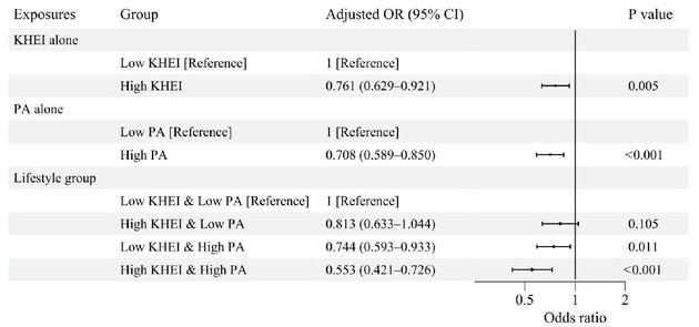 연구팀은 우울 진단자만 제외하고, 한국인 건강 식생활 지수(KHEI)와 주간 신체활동량(PA), 우울 증상 선별도구(PHQ-9) 점수를 보정해 ▲둘 다 부족 ▲식사 질만 높음 ▲운동만 활발 ▲둘 다 높음 그룹으로 나눠 비교했다.