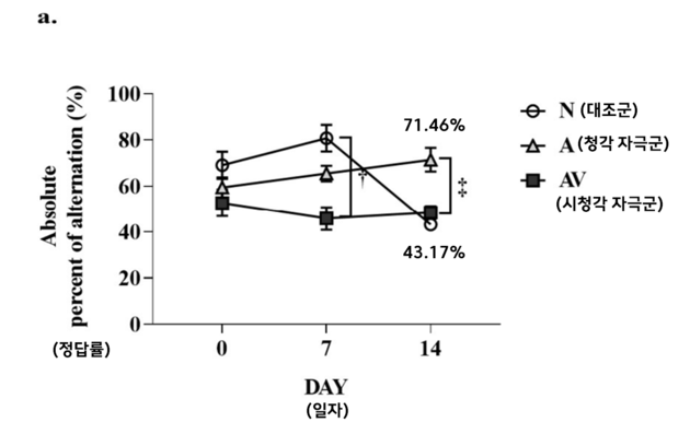이후 소음이 차단된 환경에서 40Hz 주파수의 소리와 빛 자극을 하루 2시간씩 14일 간 제공했다. 그 결과, 공간 기억력을 평가하는 '행동검사(Y-maze)'에서 40Hz 자극군의 정답률은 71.46%로, 치료를 받지 않은 대조군의 정답률 43.17%를 크게 앞질렀다.