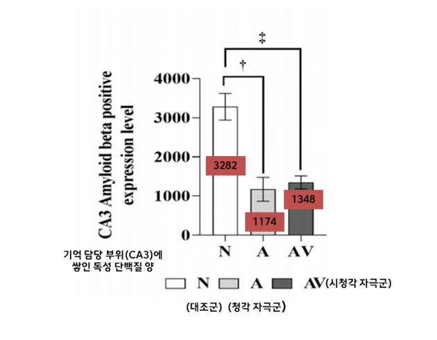 뇌 조직 분석에서도 의미 있는 변화가 확인됐다. 기억을 담당하는 뇌 부위인 해마(CA3)에서 알츠하이머병의 주요 원인 물질인 아밀로이드 베타 수치가 대조군(3282.00) 대비 청각 자극군(1174.67)에서 약 3분의 1 수준으로 급감했다.