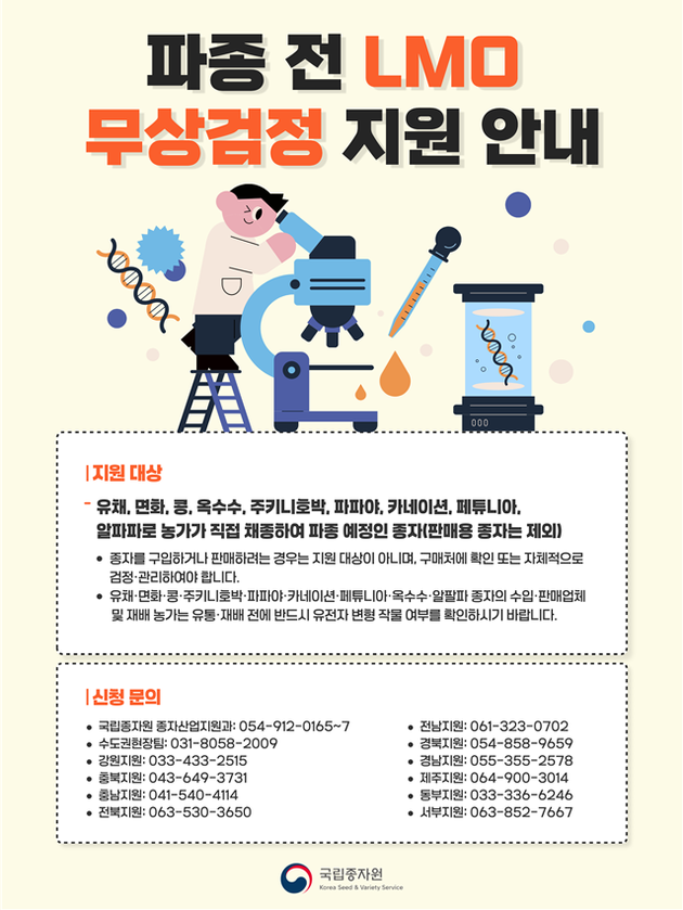 종자원 이남윤 종자산업지원과장은 "종자용 LMO가 국내 수입 승인된 적은 없으나, 유전자변형 관리작물의 유통(판매)종자와 재배지를 대상으로 지속적으로 모니터링을 실시하고 있다"고 하면서 "이번 무상검정은 종자용으로 유통(판매)되지 않는 자가소비 형태의 종자도 파종 전 검정을 통해 비의도적인 LMO 재배를 사전 예방하는 것이 목적"이라고 말했다.