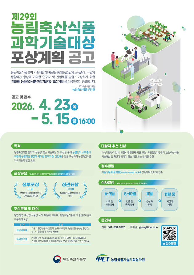 농림식품기술기획평가원(원장 노수현, 이하 농기평)은 제29회 농림축산식품 과학기술대상 후보자 추천을 내달 15일(금) 16:00까지 기술상용화 플랫폼(www.newat.or.kr)을 통해 접수받는다.
