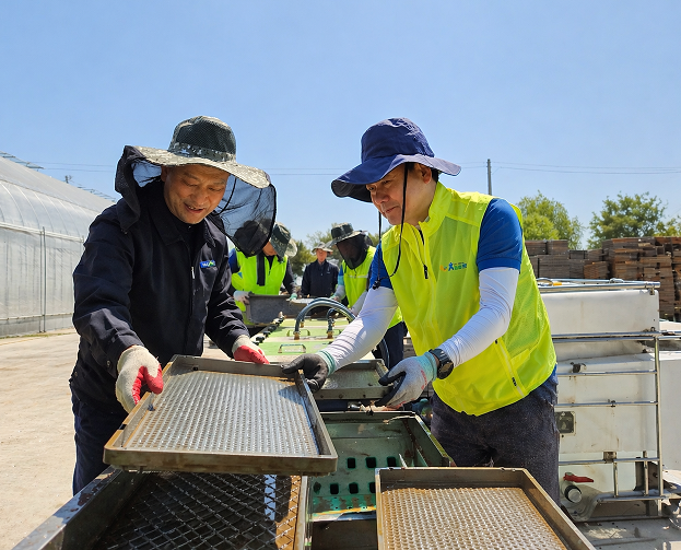 이날 김주양 대표이사를 비롯한 임직원 등은 모내기 철을 앞두고 모판 세척 및 나르기 작업에 참여하며 현장에 힘을 보태고, 육묘장 시설을 둘러보며 관계자들의 애로사항도 청취했다.