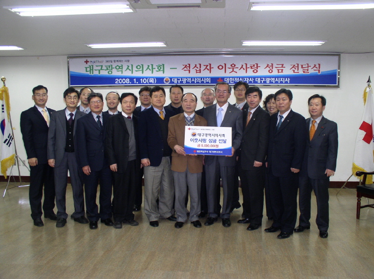 지난해 7월 지역의 소외계층을 위한 이웃사랑 실천 협약을 적십자사 대구지사와 체결한 바 있는 대구시의사회는 이날 이창 회장 및 부회장단과 각 구군의사회장, 김해수 사무처장과 함께 대한적십자사 대구지사(회장 박상운)를 방문, 불우이웃돕기 성금을 전달했다. 지난 연말 창립 60주년 기념행사로 모은 이웃돕기 사랑의 성금 1천500만원을 대구매일신문사에 기탁한데 이어 이번에도 시의사회를 비롯한 각 구군의사회에서 모금한 이웃사랑 성금 500만원을 전달한 것이다. 이번 적십자사 대구지사에 기탁한 이웃 사랑 성금은 적십자가 결연을 맺고 있는 독거노인세대와 조손세대 등에 위문품을 전달하고 무료급식 활동을 전개하는데 사용될 예정이다. 의료인의 대국민 신뢰회복과 위상제고를 위해 힘써오면서 지역사회 발전을 위한 각종 봉사활동을 펴오고 있는 대구시의사회는 회원들의 사회봉사활동 참여와 함께 연중 실시하고 있는 무료진료 외에도 소외계층을 위한 사랑의 성금전달 등 건전 기부문화 조성에 앞장서오고 있다. 이와 함께 대구시의사회는 2001년부터 매년 경북의사회와 공동으로 저소득층 환자에 대한 무료개안 수술 사업도 전개하는 등 이를 통해 2007년까지 총 474명에게 밝은 빛을 안겨주기도 했다. |