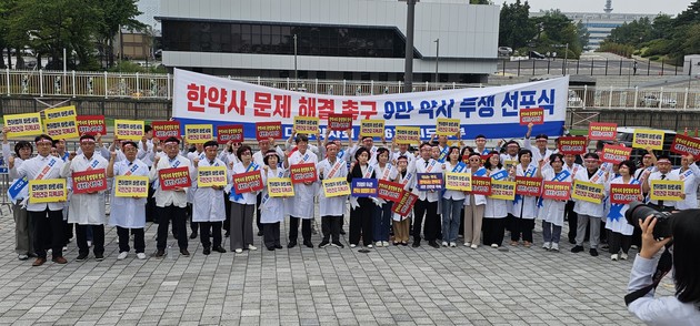 대한약사회가 30일 서울 용산 대통령실 앞에서 전국 16개 시·도지부와 함께 '한약사 문제 해결 촉구 9만 약사 투쟁 선포식'을 갖고, 정부가 책임 있는 해결책을 제시할 때까지 투쟁을 멈추지 않겠다고 선언했다.