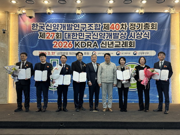 한국신약개발연구조합(이사장 김정진, 이하 신약조합)은 지난 달 27일 서울 삼정호텔 제라늄홀에서 제6회 바이오헬스산업산분야 유공자 표창식 및 제12회 제약산업 혁신성과 실용화연계 우수전문가 표창식을 개최했다고 밝혔다.