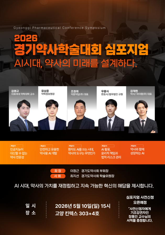 행사의 핵심인 학술 심포지엄에서는 카이스트 장동인 교수가 'AI가 가져올 미래의 모습과 약사의 준비전략'을 주제로 기조강연에 나선다. 이어지는 메인 심포지엄에서는 학계와 현장 전문가들이 모여 △인공지능이 대신할 수 없는 약사 전문성 △안전하고 유용한 약사용 AI 개발 △AI 활용에 따른 윤리적 책임과 법적 리스크 관리 등을 심도 있게 논의할 예정이다.